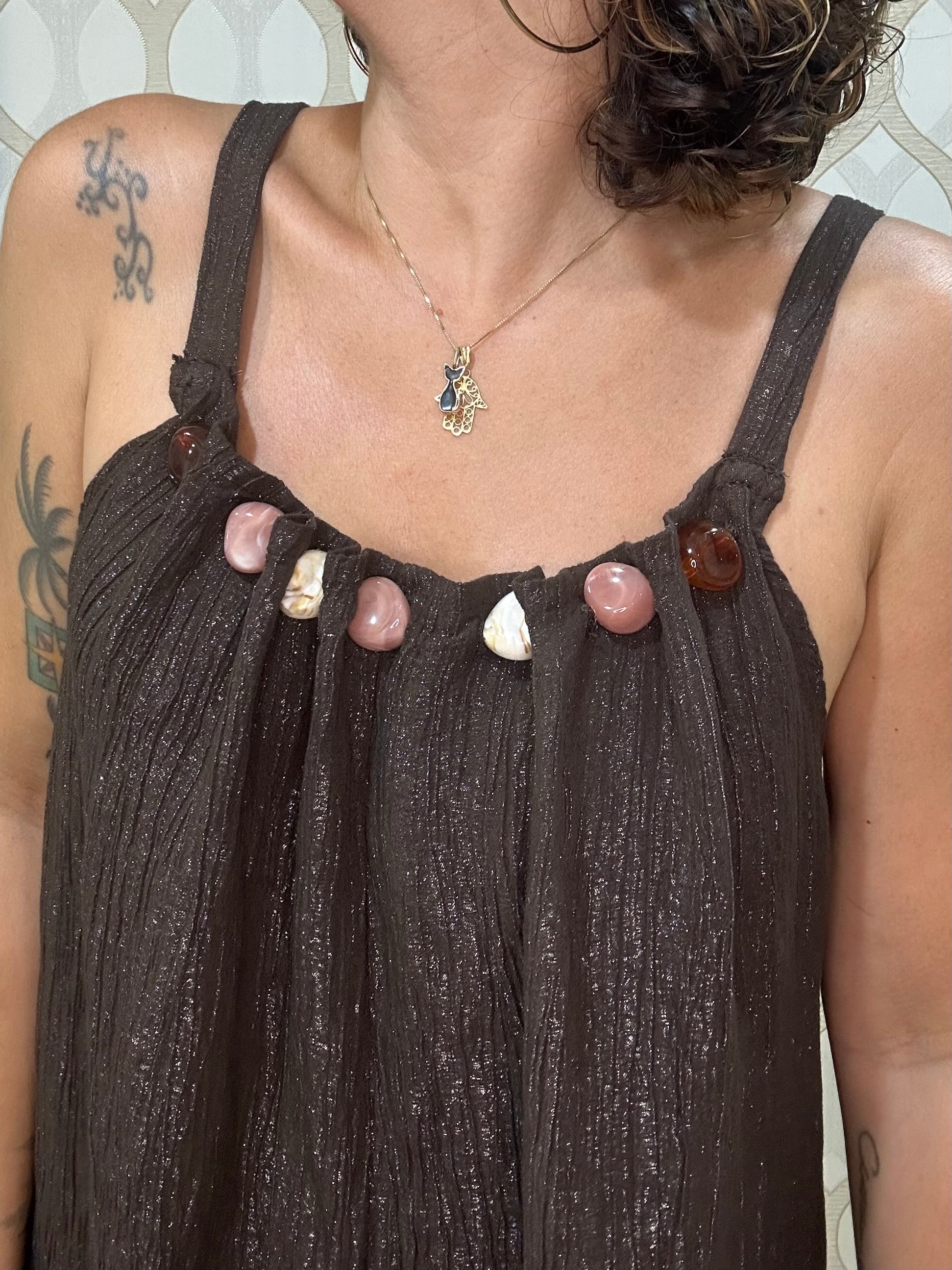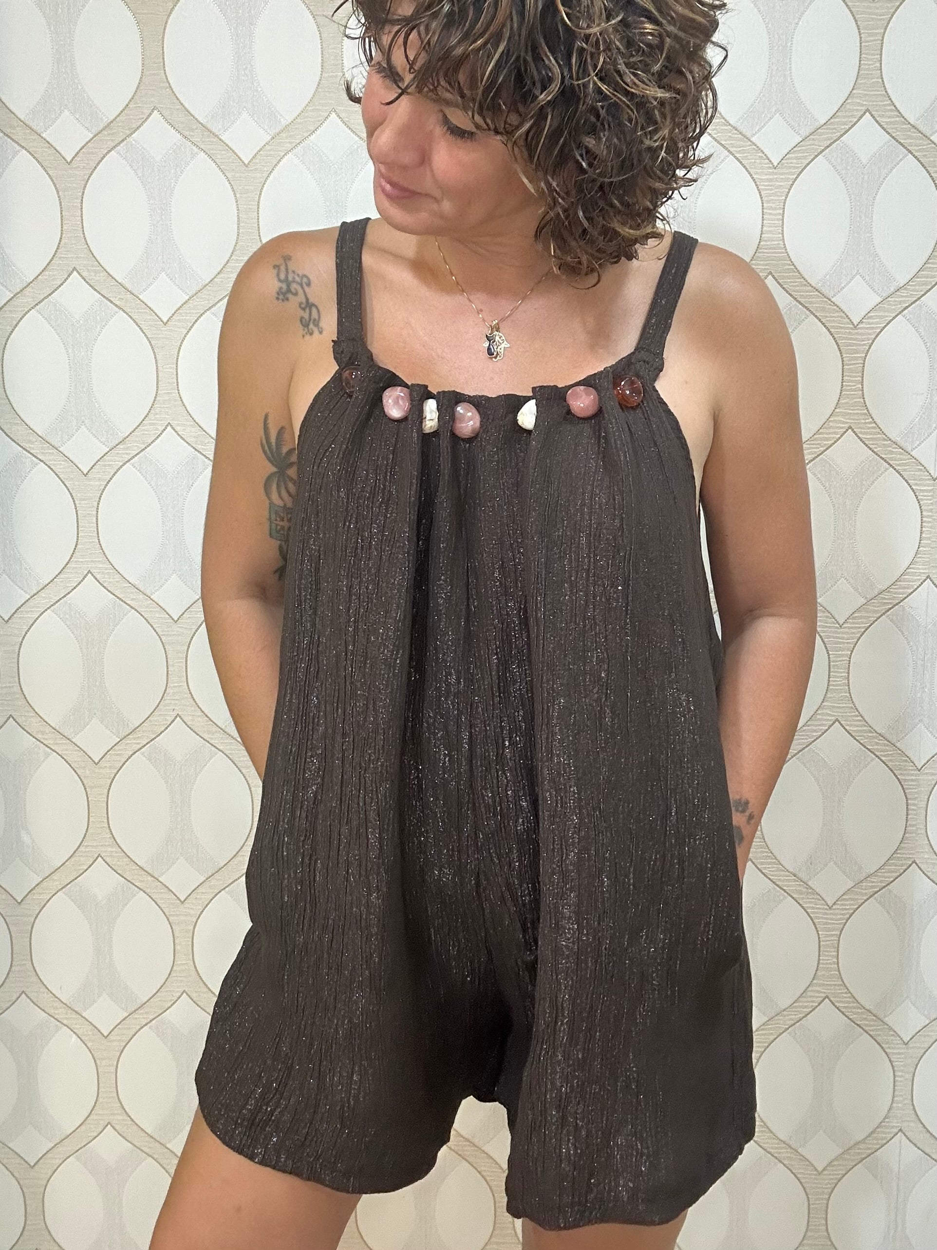 Mono corto con bolsillos, brillante, con detalle de piedras en el escote