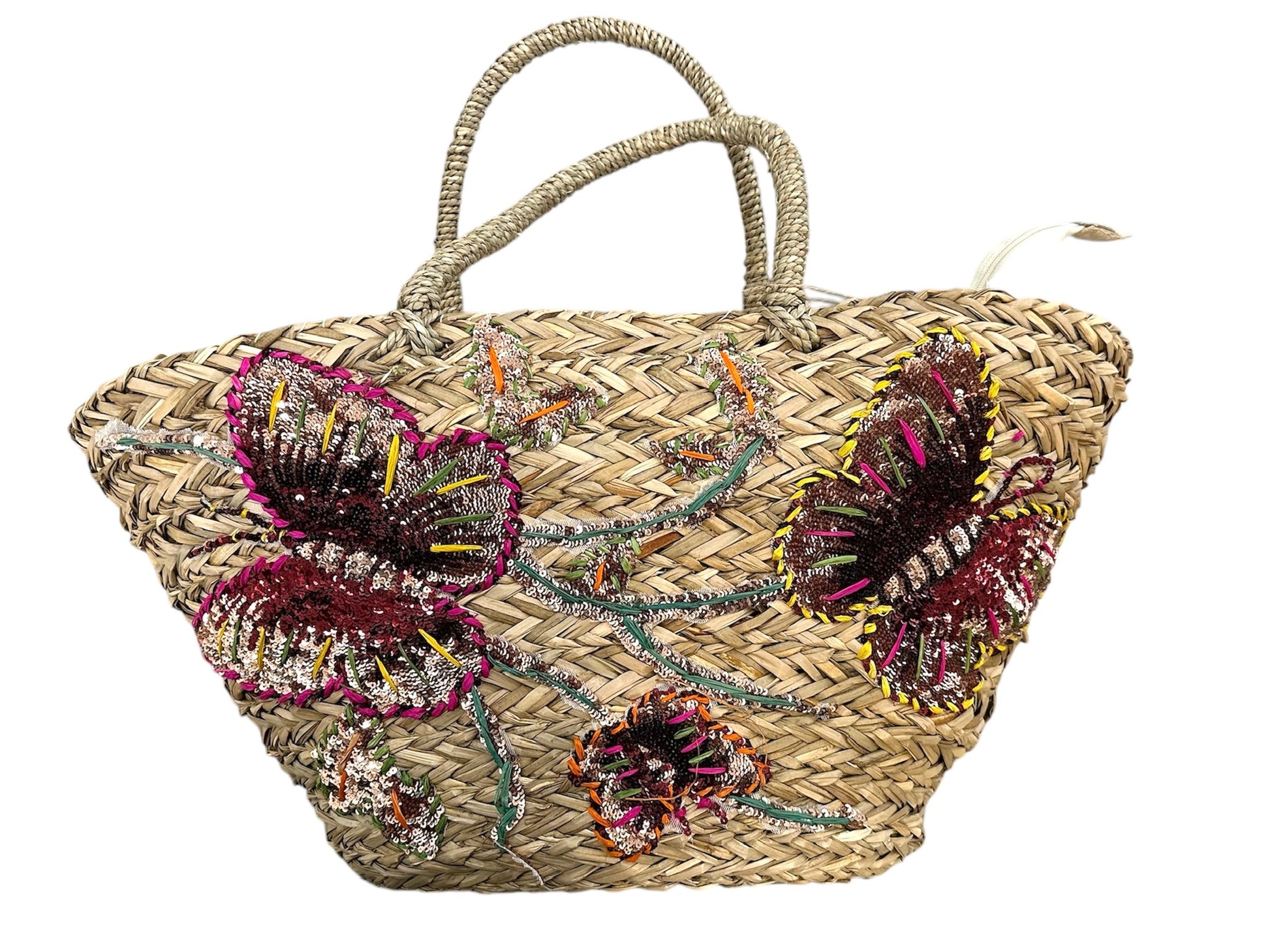 Capazo con detalle de mariposas de lentejuelas, forrado por dentro con un estampado de mariposas