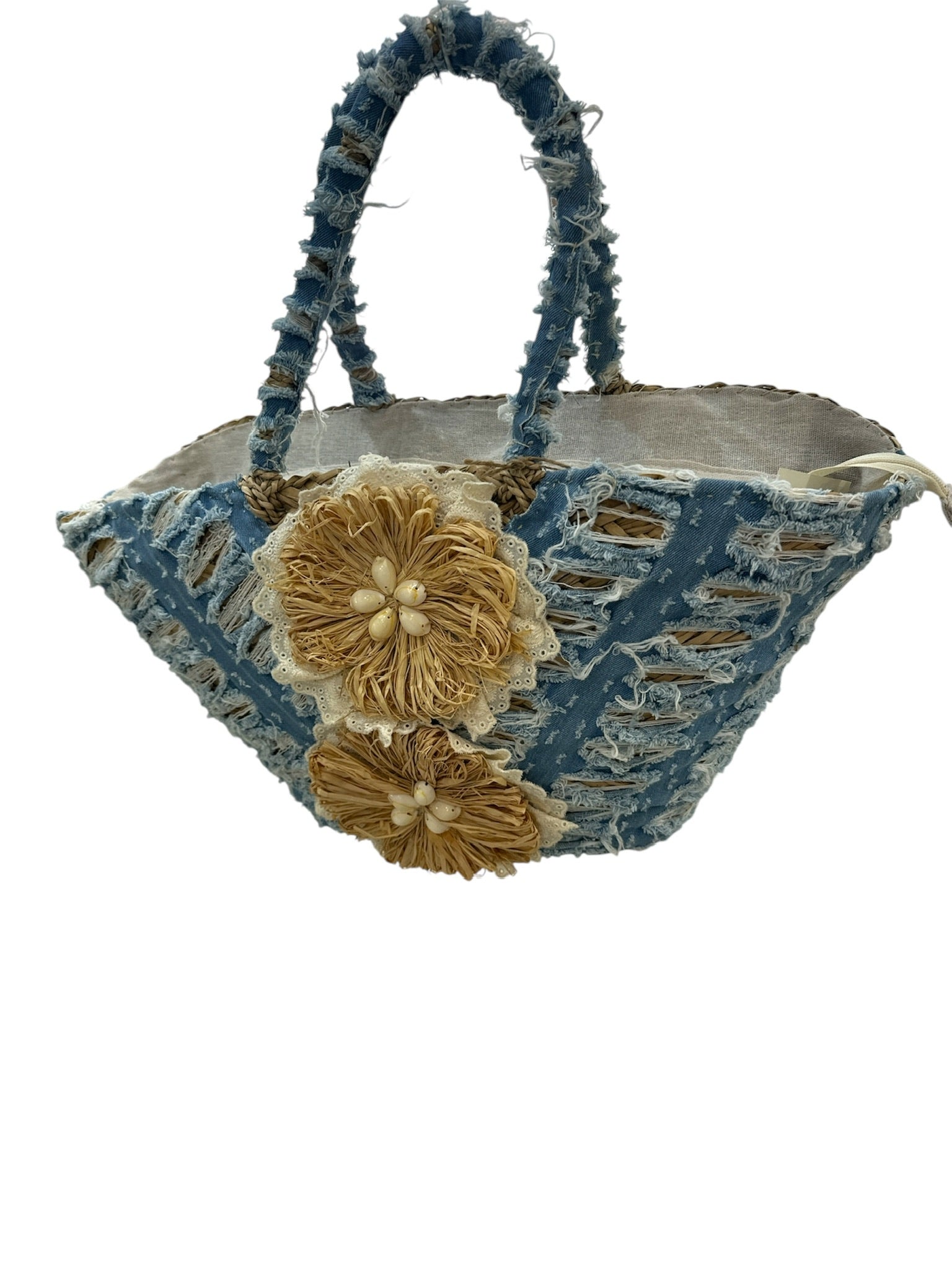 Capazo de mano forrado de tejido tejano con detalle de conchas