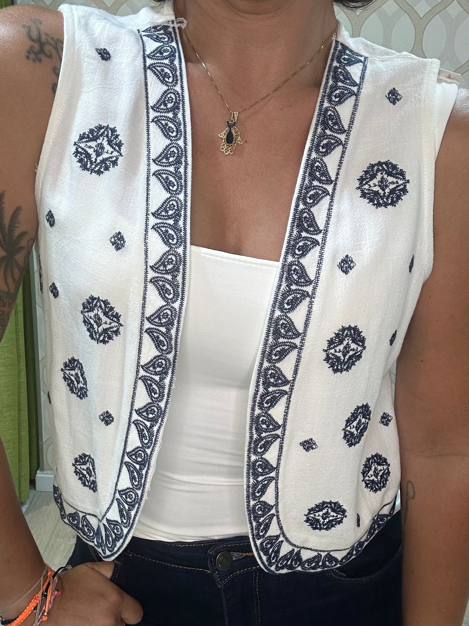 Chaleco lino blanco, talle corto. Detalle de un bordado por toda la parte frontal.